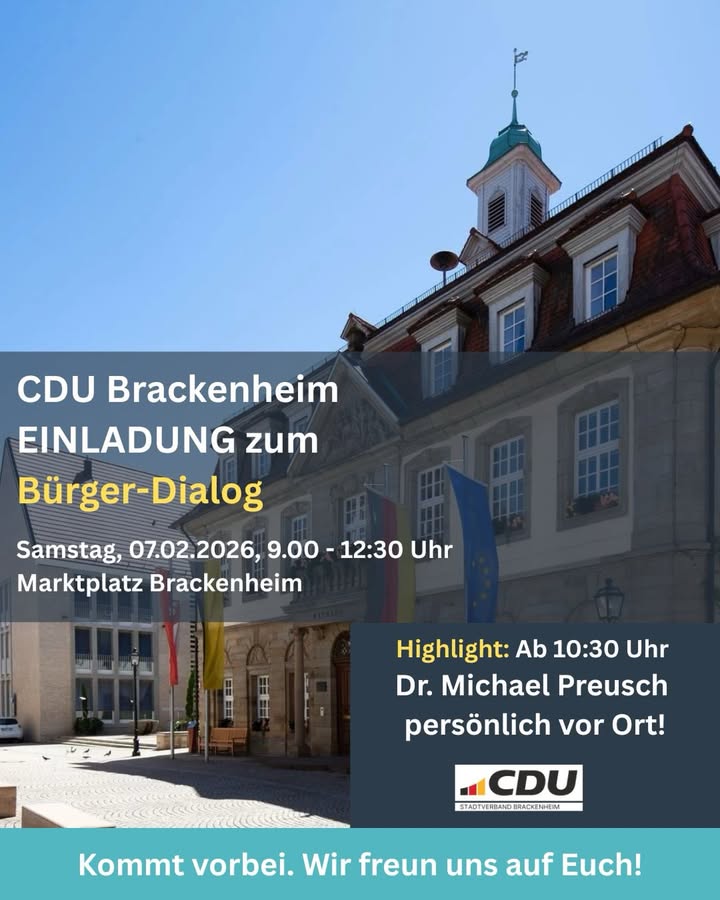 Heimatnah. Kompetent. Auf ein Wort am Marktplatz!Die Landtagswahl am 8. März rückt näher ? Zeit für persönlichen Austausch und klare Antworten.Am kommenden Samstag ist es wieder so weit: Wir von der CDU Brackenheim sind mit unserem ersten Infostand für Euch da!📍 Wo? Marktplatz Brackenheim 🕘 Wann? Samstag, 09:00 bis 12:30 Uhr✨ Highlight: Ab 10:30 Uhr besucht uns unser Landtagsabgeordneter und Kandidat Dr. Michael Preusch persönlich! Nutze die Chance: Egal ob politische Fachfragen zur Landespolitik, Anliegen aus unserer Region oder einfach nur ein nettes "Schwätzle" ? Michael Preusch nimmt sich Zeit für Dich.Wir wollen gemeinsam mit Euch die Weichen für ein starkes Baden-Württemberg stellen.Kommt vorbei ? wir freuen uns auf gute Gespräche in der Mitte unserer Stadt!@preuschmichael #brackenheim #CDUBrackenheim #TeamPreusch #LTW2026 #BadenWürttemberg