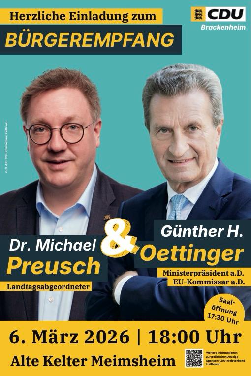 Politisches Schwergewicht zu Gast in Brackenheim!Wir bringen die große Politik ins Zabergäu!Die CDU Brackenheim freut sich riesig, einen der profiliertesten Köpfe unserer Region und Europas begrüßen zu dürfen: Günther H. Oettinger, Ministerpräsident a.D. und EU-Kommissar a.D. 🏛️Wer ihn schon einmal erlebt hat, weiß: Es erwartet uns kein trockenes Referat, sondern Klartext, Leidenschaft und eine Prise des typischen oettingerschen Humors. Gemeinsam mit unserem Landtagsabgeordneten Dr. Michael Preusch blicken wir auf die Herausforderungen unserer Zeit und die Zukunft unserer Heimat. 🤝Nutzt die Gelegenheit, Politik hautnah zu erleben und euch bei einer kleinen Bewirtung 🥨🍷 in der besonderen Atmosphäre der Alten Kelter in Meimsheim auszutauschen.🗓️ WANN: Freitag, 06. März 2026⏰ BEGINN: 18:00 Uhr (Einlass ab 17:30 Uhr)📍 WO: Alte Kelter, MeimsheimKommt vorbei, hört rein und diskutiert mit ? wir freuen uns auf euch! @preuschmichael @oettinger#Brackenheim #CDUBrackenheim #Zabergäu #CDU #GuentherOettinger #MichaelPreusch #Bürgerempfang #HeimatStärken #PolitikHautnah #Klartext