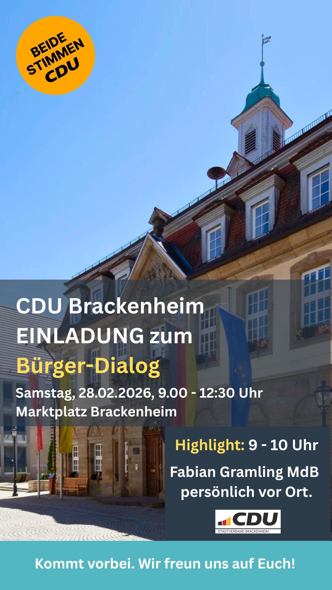 mehrWir laden euch herzlich zu unserem zweiten Bürger-Dialog auf dem Marktplatz ein! 🥨☕️Von 09:00 bis 12:30 Uhr sind wir für euch da. Nutzt die Gelegenheit für ein persönliches Gespräch mit unserem Landtagsabgeordneten und Kandidaten Dr. Michael Preusch, der ab 10:30 Uhr mit am Stand dabei ist! 🙋♂️🙌Was bewegt euch in Brackenheim? Welche Themen liegen euch für Baden-Württemberg am Herzen? Wir hören zu ? ohne Zeitdruck und direkt im Herzen unserer Stadt. 💬Kommt vorbei ? wir freuen uns auf euch! ?🤝📍 Marktplatz Brackenheim🗓️ Samstag, 14.02.⏰ Stand ab 09:00 Uhr | Michael Preusch ab 10:30 Uhr#brackenheim #zabergäu #ltw2026 #michaelpreusch #cdubrackenheim