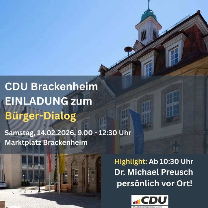Heimatnah. Kompetent. Auf ein Wort am Marktplatz!Die Landtagswahl am 8. März rückt näher ? Zeit für persönlichen Austausch und klare Antworten.Am kommenden Samstag ist es wieder so weit: Wir von der CDU Brackenheim sind mit unserem ersten Infostand für Euch da!📍 Wo? Marktplatz Brackenheim 🕘 Wann? Samstag, 09:00 bis 12:30 Uhr✨ Highlight: Ab 10:30 Uhr besucht uns unser Landtagsabgeordneter und Kandidat Dr. Michael Preusch persönlich! Nutze die Chance: Egal ob politische Fachfragen zur Landespolitik, Anliegen aus unserer Region oder einfach nur ein nettes "Schwätzle" ? Michael Preusch nimmt sich Zeit für Dich.Wir wollen gemeinsam mit Euch die Weichen für ein starkes Baden-Württemberg stellen.Kommt vorbei ? wir freuen uns auf gute Gespräche in der Mitte unserer Stadt!@preuschmichael #brackenheim #CDUBrackenheim #TeamPreusch #LTW2026 #BadenWürttemberg