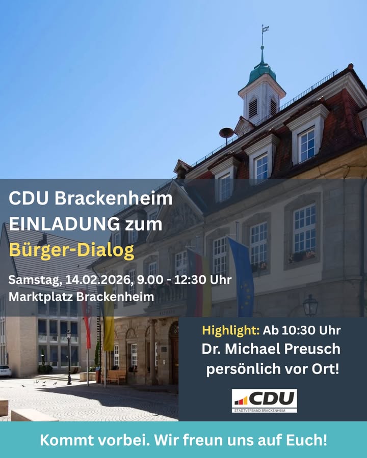 Wir laden euch herzlich zu unserem zweiten Bürger-Dialog auf dem Marktplatz ein! 🥨☕️Von 09:00 bis 12:30 Uhr sind wir für euch da. Nutzt die Gelegenheit für ein persönliches Gespräch mit unserem Landtagsabgeordneten und Kandidaten Dr. Michael Preusch, der ab 10:30 Uhr mit am Stand dabei ist! 🙋♂️🙌Was bewegt euch in Brackenheim? Welche Themen liegen euch für Baden-Württemberg am Herzen? Wir hören zu ? ohne Zeitdruck und direkt im Herzen unserer Stadt. 💬Kommt vorbei ? wir freuen uns auf euch! ?🤝📍 Marktplatz Brackenheim🗓️ Samstag, 14.02.⏰ Stand ab 09:00 Uhr | Michael Preusch ab 10:30 Uhr#brackenheim #zabergäu #ltw2026 #michaelpreusch #cdubrackenheim