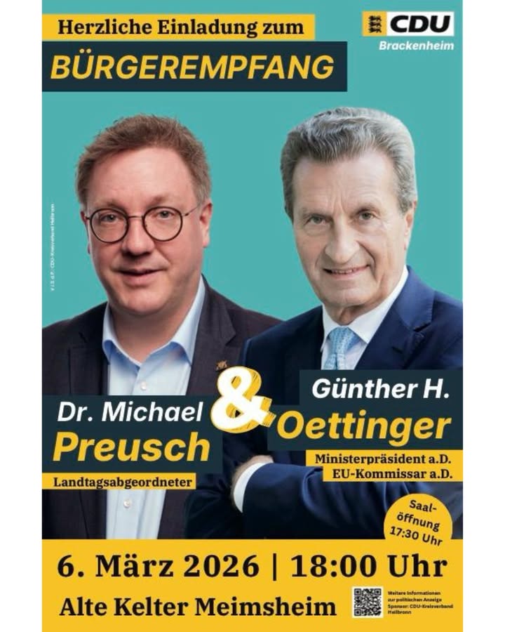 Politisches Schwergewicht zu Gast in Brackenheim!Wir bringen die große Politik ins Zabergäu!Die CDU Brackenheim freut sich riesig, einen der profiliertesten Köpfe unserer Region und Europas begrüßen zu dürfen: Günther H. Oettinger, Ministerpräsident a.D. und EU-Kommissar a.D. 🏛️Wer ihn schon einmal erlebt hat, weiß: Es erwartet uns kein trockenes Referat, sondern Klartext, Leidenschaft und eine Prise des typischen oettingerschen Humors. Gemeinsam mit unserem Landtagsabgeordneten Dr. Michael Preusch blicken wir auf die Herausforderungen unserer Zeit und die Zukunft unserer Heimat. 🤝Nutzt die Gelegenheit, Politik hautnah zu erleben und euch bei einer kleinen Bewirtung 🥨🍷 in der besonderen Atmosphäre der Alten Kelter in Meimsheim auszutauschen.🗓️ WANN: Freitag, 06. März 2026⏰ BEGINN: 18:00 Uhr (Einlass ab 17:30 Uhr)📍 WO: Alte Kelter, MeimsheimKommt vorbei, hört rein und diskutiert mit ? wir freuen uns auf euch! @preuschmichael @oettinger#Brackenheim #CDUBrackenheim #Zabergäu #CDU #GuentherOettinger #MichaelPreusch #Bürgerempfang #HeimatStärken #PolitikHautnah #Klartext