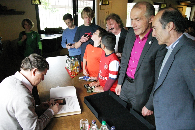 Im Sportheim des TGV gab es im Anschluss noch eine Autogrammstunde, bei der "Rehhakles" gerne jedem Unterschrifts- und Fotowunsch nachkam. Selbst Brackenheims Bürgermeister Rolf Kieser ließ sich die Gelegenheit nicht entgehen und brachte das Goldene Buch der Stadt zur Autogrammstunde mit. Der CDU-Vorsitzende Thomas Paul ließ in seinem kurzen Grußwort die unzähligen Erfolge Rehhagels Revue passieren. Unter großem Applaus konnte Rehhagel diese Aufzählung sogar noch ergänzen: "Ich bin der Trainer, der am häufigsten gegen Bayern gewonnen hat!" Unter der Moderation des CDU-Bundestagsabgeordneten und früheren Spitzensportlers Eberhard Gienger schloss sich eine rege Diskussion mit den anwesenden Jugendlichen an. Die beiden Sport-Ikonen plauderten so manches aus dem Nähkästchen. Den Beteiligten hat es sichtlich Spaß gemacht. Besonders Rehhagels Antwort auf die Frage wie er es in Griechenland geschafft hat, mit dieser Mannschaft Europameister zu werde ohne deren Sprache zu sprechen war beeindruckend: „ Du musst die Herzen der Menschen gewinnen“.