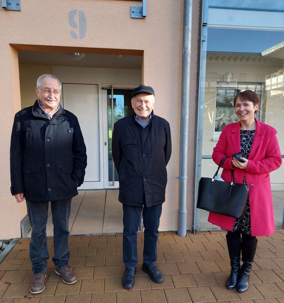 Kreistagsabgeordnete Jutta Layher und der Fraktionsvorsitzende im Gemeinderat, Helmut Kayser die Glückwünsche des CDU-Stadtverbandes verbunden mit einem Geschenk im Innenhof der Wohnanlage unter Beachtung der Corona-Vorschriften.